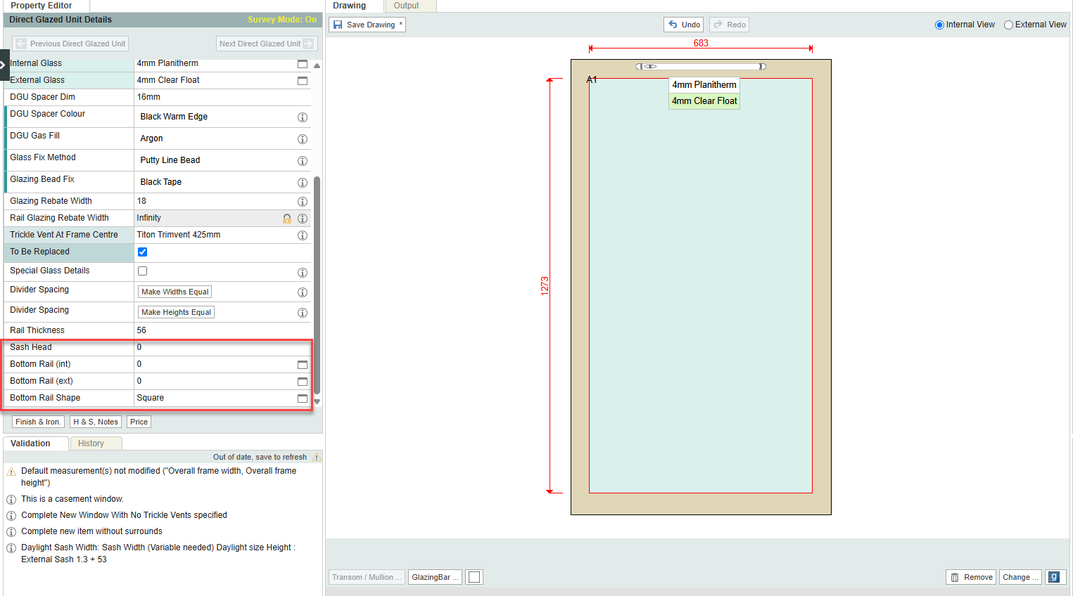 - Set the desired dimensions. The bottom rail can be chamfered or stepped as well as square, which is why it has internal and external heights.