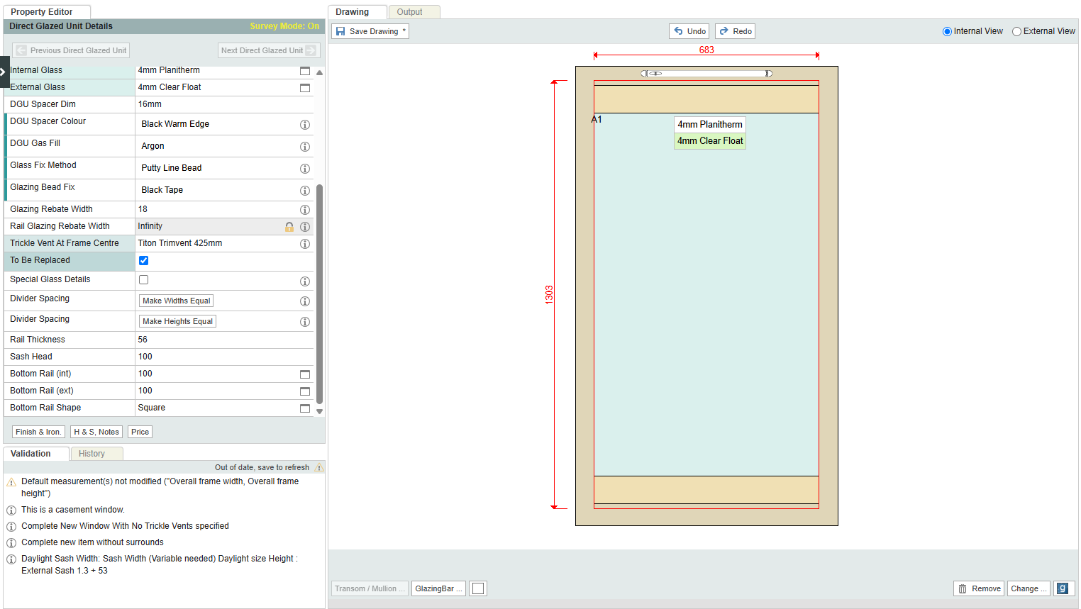 integrate can draw a direct glazed unit with a bottom rail and/or a head rail. This is particularly useful when drawing a doorset with direct glazed sidelights, which need top and bottom rails to align with those of the doors.