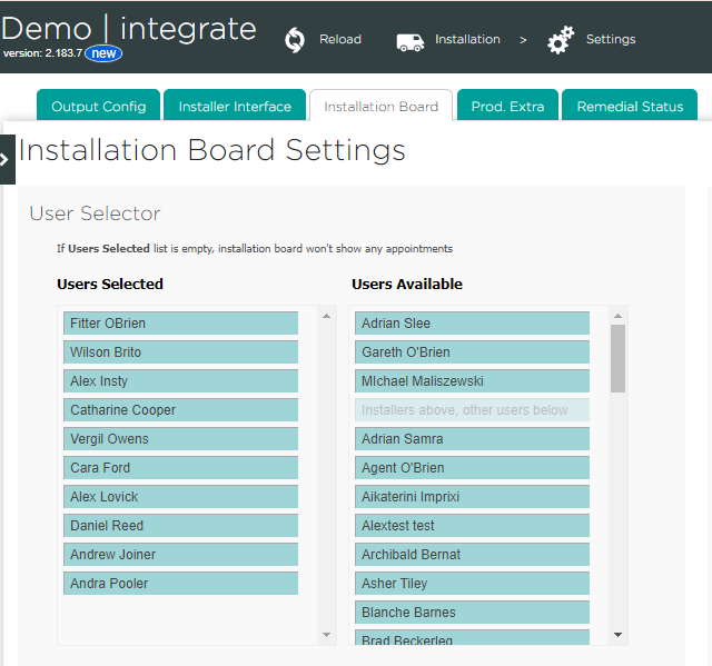 3. Here, you can drag users to the Users Selected column to add them to the installation board, or drag them back to Users Available to remove them.