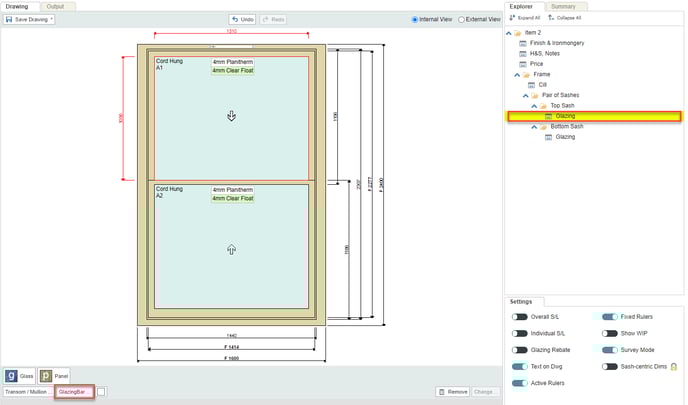 - Select a Glazing section and then click the GlazingBar button at the bottom.