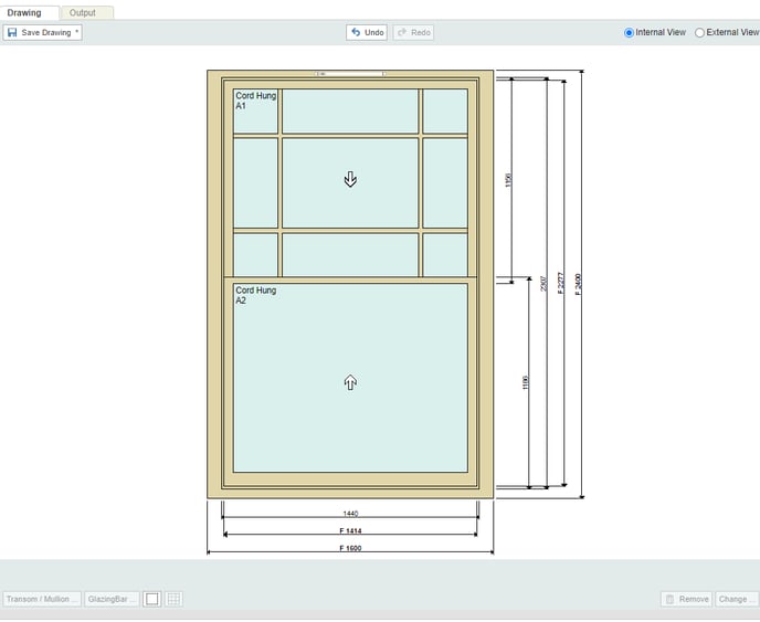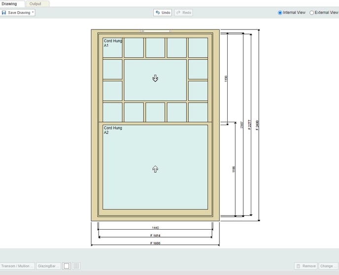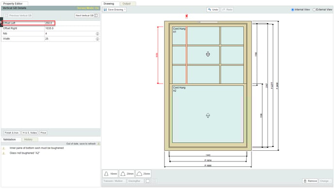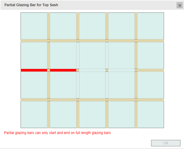 Not every design is supported by the system: all partial glazing bars must start at the edge of the sash, and join on to a full length glazing bar. Illegal designs will be highlighted in red.
