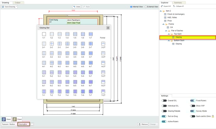 - Now select the bottom Glazing section, click the GlazingBar button, and choose the 5x3 design.