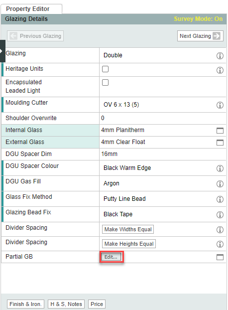 - In Property Editor for Glazing Details, click the Edit button next to Partial GB.