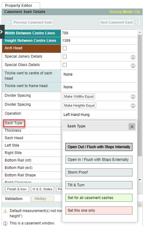- To change whether the sash opens inwards or outwards, or to choose between flush/stormproof/tilt & turn options, select the Casement Sash and then click the option next to Sash Type. After choosing an option, you can either apply the change to all casement sashes in the drawing, or to the selected sash only.