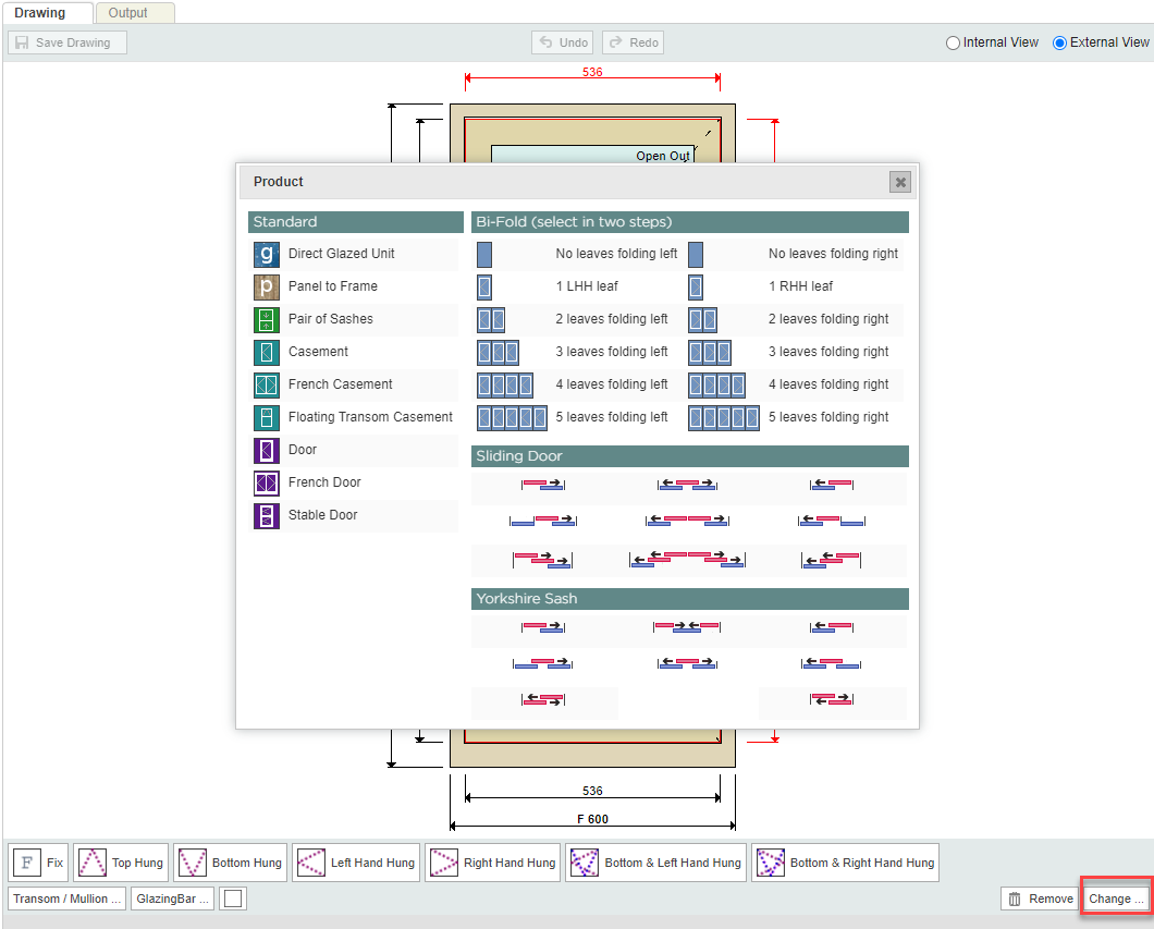 - To change a single casement to a pair of French casements or a floating transom casement/mock sash, select the Casement Sash, then click Change... in the bottom right and choose the relevant option.