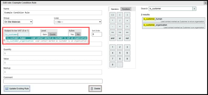 By using the Boolean variable 'is_customer_human' this allows us to only trigger the low VAT if the main contact for the lead is tagged as a human and not an organisation