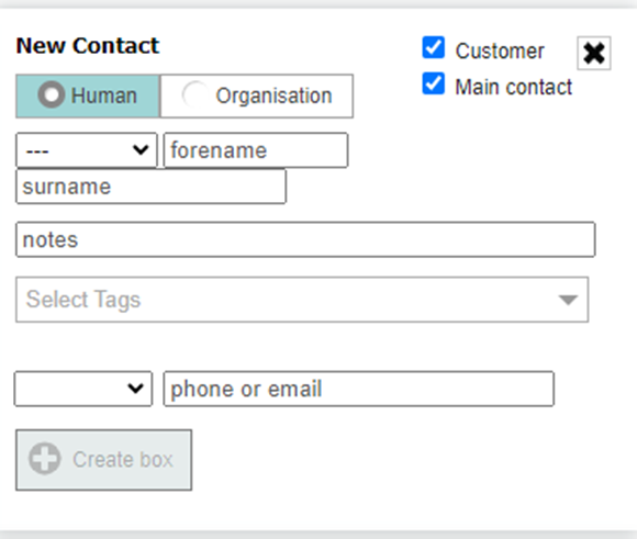 Step 3 - Choose the contact type. On the right-hand side of the screen, select human for a homeowner or organisation for a business. Enter the contact’s name and details, then click create box.