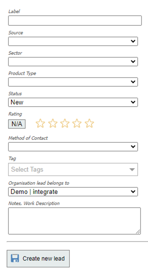 Step 6 - Complete the details. Complete any fields on the left (for example, source, method of contact). These fields are optional and can be filled later. When ready, click create new lead.
