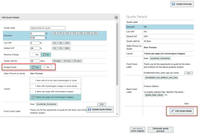Set budget quote to yes, click update quote details.
