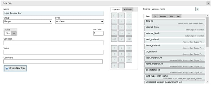 For more on writing conditions, see the article on Working with rule editors. - The Value determines the text that appears on the glass cutting list, and the width of the astragal bar in the drawing. The width of the bar in mm should be placed before a | symbol, followed by the desired text, as in the example below: