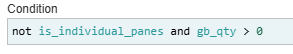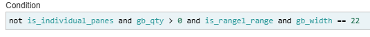 - The Condition determines when the rule is triggered. See the example condition below, which will trigger for any item that is not set to individual panes/heritage units, and has more than one glazing bar: