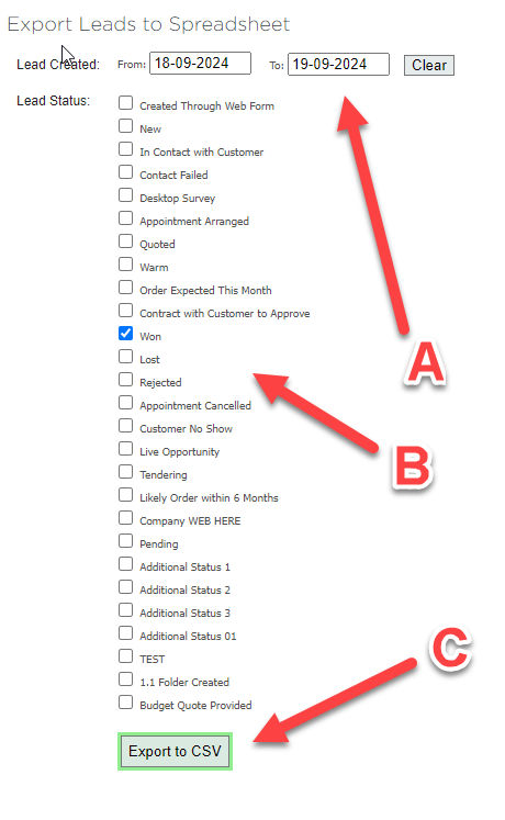 Note: Leads can also be exported directly from the lead list. Click export to CSV in the bottom-right corner of the screen.