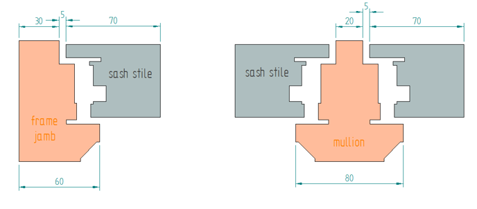 Assuming that The item in Example 2 is an opening out casement, when looking at the finished product externally, the customer will see a 20mm mullion with 5mm clearance and 70mm sash stile. To oversimplify slightly, we do not care what is in the middle, we are only interested in the internal and external faces of the item.