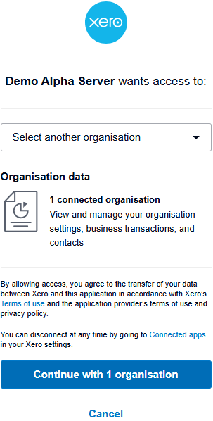 If prompted, log into the Xero account. On the access page, select the organisation and click “Continue.”