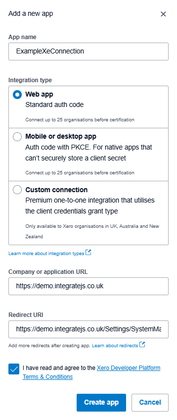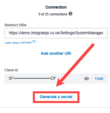 - Redirect URL - The URL for the accounting system tab within the integrate application (e.g. https://demo.integratejs.co.uk/Settings/SystemManagement/AccountingSystem)