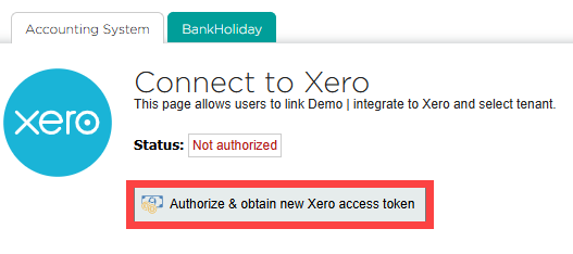 Step 6 - Obtain Xero access token. In integrate, click the name in the top-right, then go to settings > system management > accounting system, and click authorize & obtain new Xero access token.
