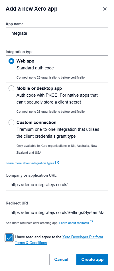 d. Redirect URL - the URL for the accounting system tab within the integrate application (e.g. https://demo.integratejs.co.uk/Settings/SystemManagement/AccountingSystem)