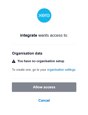 If a new user, and the Xero message "You have no organization setup" is seen, click the link for organisation settings to configure an organisation within Xero for your business.