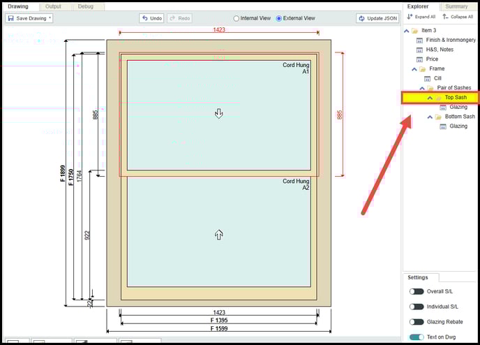 Step 2. Select the 'Top Sash' by either using the 'Explorer' on the right hand side of the screen or by directly clicking on the top sash within your drawing.