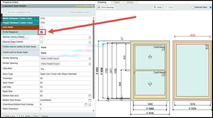 Step 3. On the left hand side under the property editor untick 'To Be Replaced' tick box, this will then remove the sash from the frame leaving you with the frame only.