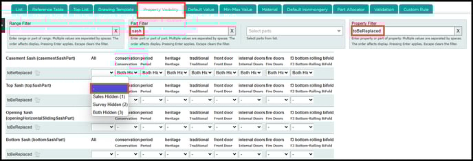 Step 2. Navigate to the 'Property Visibility' tab, then under the part filter search for 'Sash' and under the property filter search 'toBeReplaced'