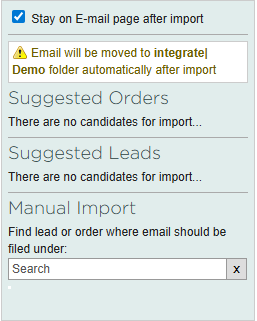 Locate the email in the inbox or sent items. The system will suggest the correct lead or order on the right. If no suggestion appears, search for the relevant record under manual import.
