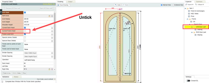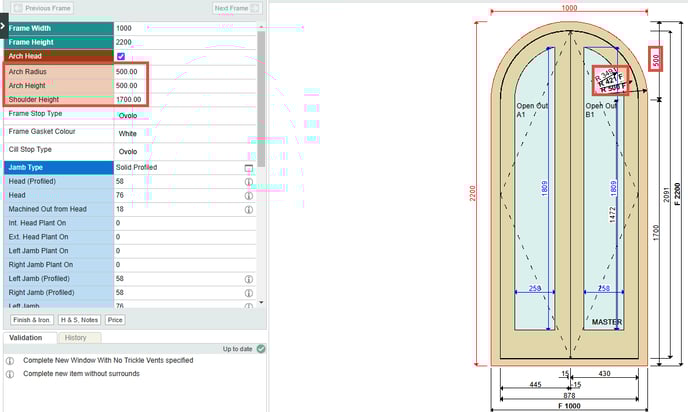 After you have selected the frame you will see the "Property Editor" on the left hand side of the drawing board. Locate the option for "Arch Head" and enable this tick box, in doing so three properties (Arch Radius, Arch Height and Shoulder Height) should appear.