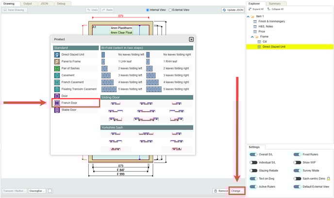 3. You will see a small "Change" button located to the bottom right of the drawing, select this and choose the "French Door" option from within the list.