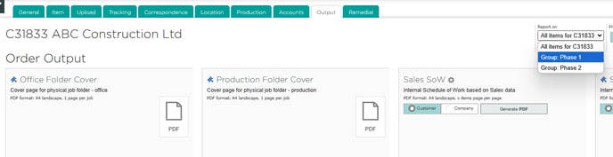 - Once you have split an order, many of the production outputs on the Output tab can be generated for one specific group/phase. These are identifiable by the blue puzzle piece