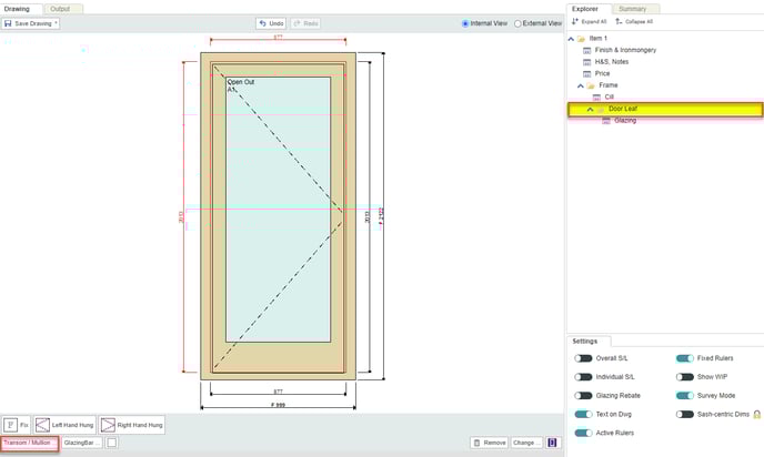 • To draw a door with multiple panels, first select the Door Leaf, then click Transom / Mullion below the drawing.
