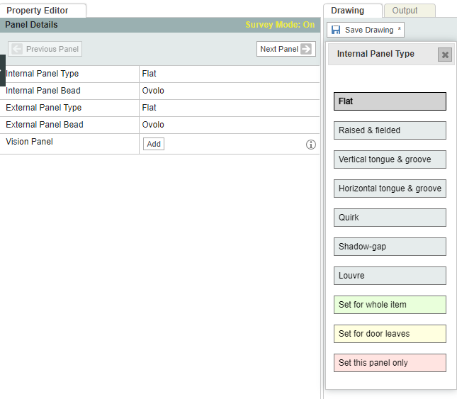 • To change the panel type (flat, raised & fielded, etc) and beading (ovolo, pencil, etc), click the Panel then select the options on the left. Internal and external designs are configured separately.