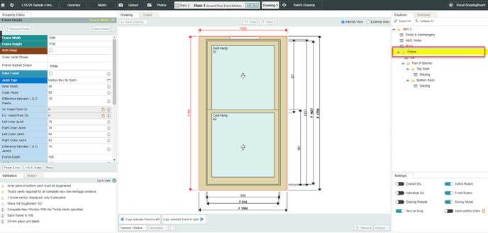 1. There are two ways to navigate the DrawingBoard: either click on the part of the drawing that you want to make changes to, or click on the name of the part in the Explorer pane on the right-hand side. For example, to make changes to the frame, either click the frame itself, or click “Frame” in the Explorer.