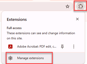 - Click the puzzle piece icon in the top right of Chrome, then "Manage Extensions". (You can also access this page via the main Settings page.)