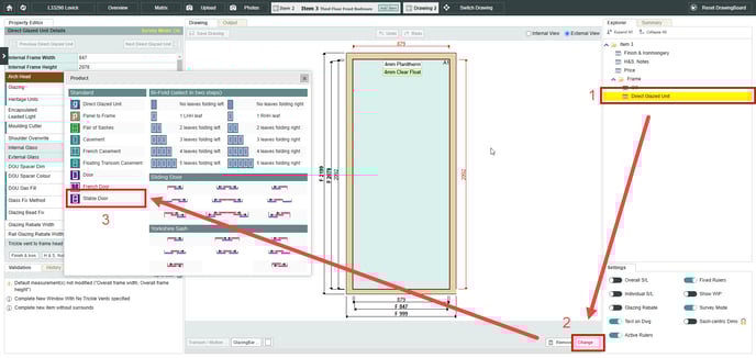 Step 2. Make a stable door by selecting the interior of the door, the clicking the 'Change' Button on the bottom right. This will pop up the product type selector, simply select the 'Stable Door' option within this menu.
