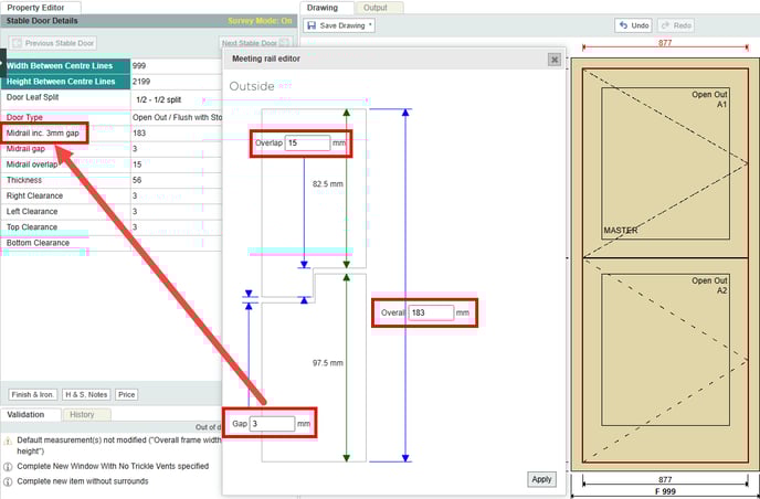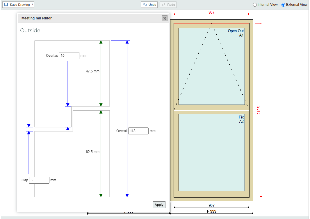 Step 4. Within the editor you will see a visual preview of meeting rail section with three properties boxes allowing you to change the 'overlap', 'gap' and 'overall size' of the meeting rail. You can now enter your desired values and once satisfied with the measurements simply press 'Apply' in the bottom right of the meeting rail editor.