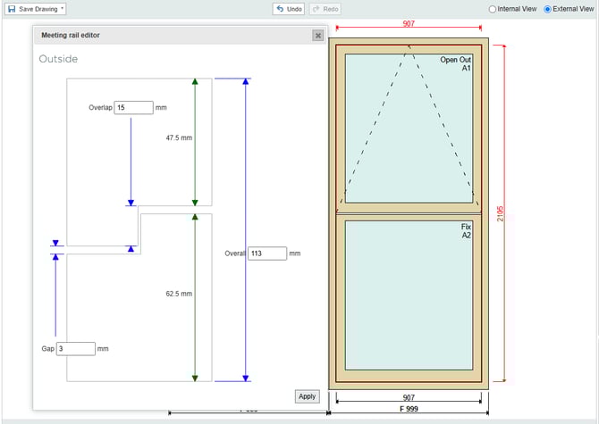 In the property editor, change the overlap, gap and overall size of the meeting rail. Enter the desired values into the property boxes. Once satisfied with the measurements, click apply in the bottom right of the meeting rail editor.