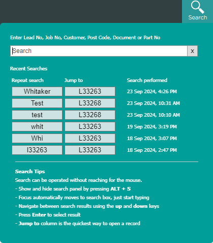 Learn how to search, filter and open leads, enquiries and related documents using the main search bar.