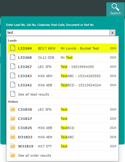 Step 2 - Start a search. Type a name, number or keyword and select the relevant result from the dropdown. The dropdown shows matching leads, folders and documents.