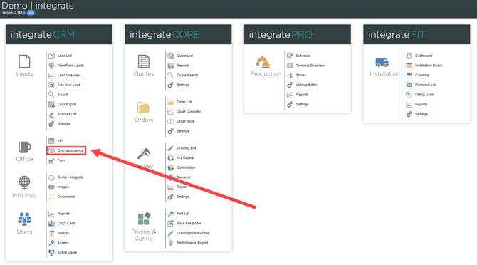 Step 1 – Go to the correspondence page. From integrateCRM home page, click on correspondence.