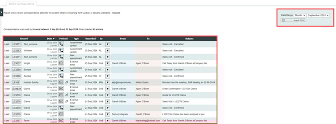 Step 3 – Adjust the date range. Click on the dropdown menu on the right of the screen, to adjust the date range for displayed correspondence, by: