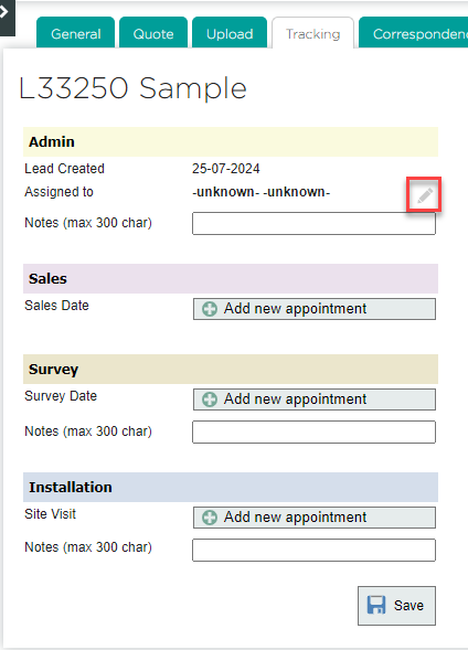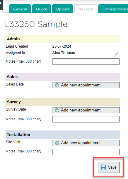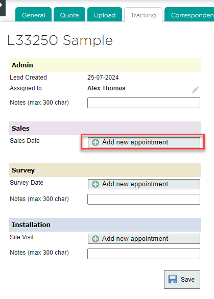 - From the Tracking tab of a lead, click Add new appointment under Sales.