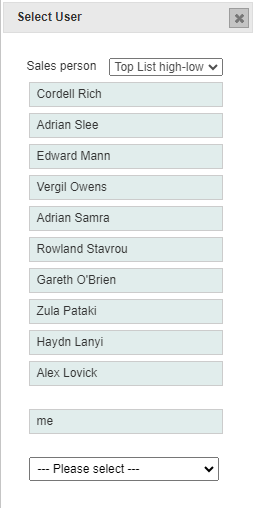 - The system will offer a selection of the most frequently assigned sales people: click one of the names, or access the full list of users via the drop-down menu at the bottom.
