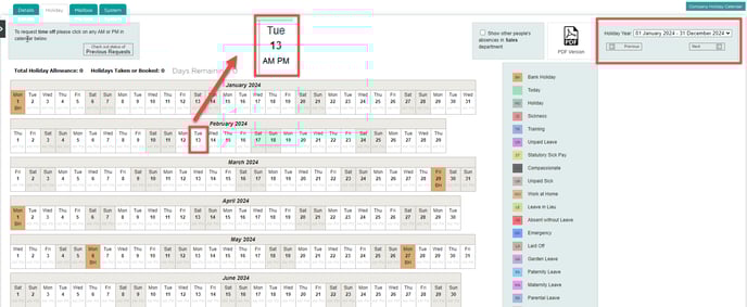 4. The Holiday Tab offers users a range of options to manage their holiday allowance effectively and view other absences within their department. Additionally, users can easily request time off by selecting the "AM" or "PM" buttons for specific dates on the calendar with a simple click.