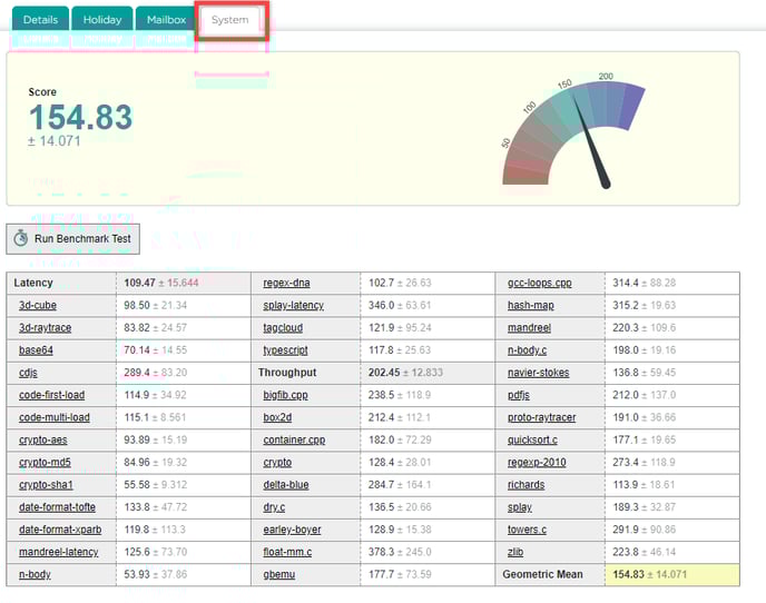 6. The "System" tab enables users to conduct a benchmark test to determine if their device has sufficient resources to run integrate effectively. When you click the "Run Benchmark Test" button, the system will initiate a series of performance tests on your device.
